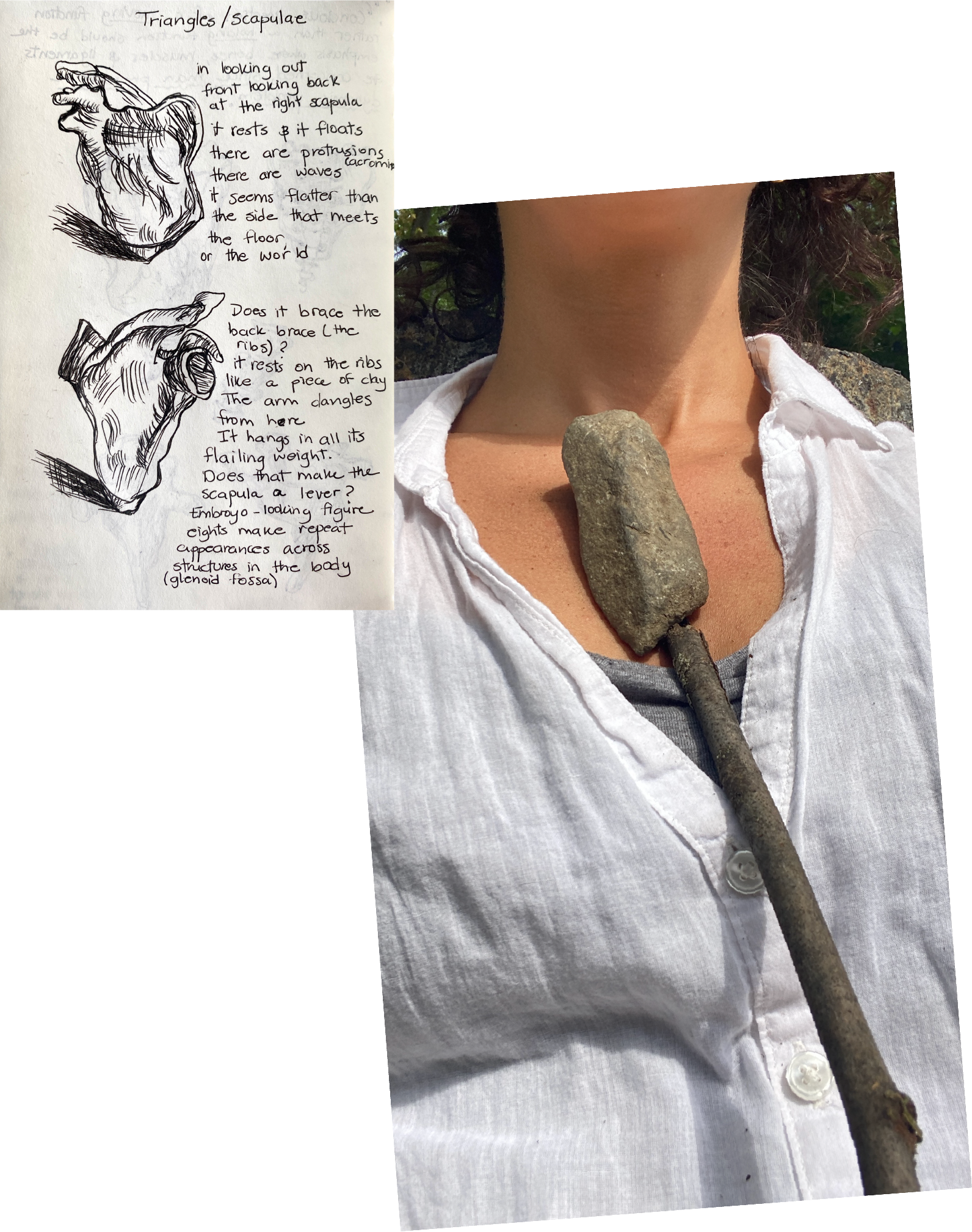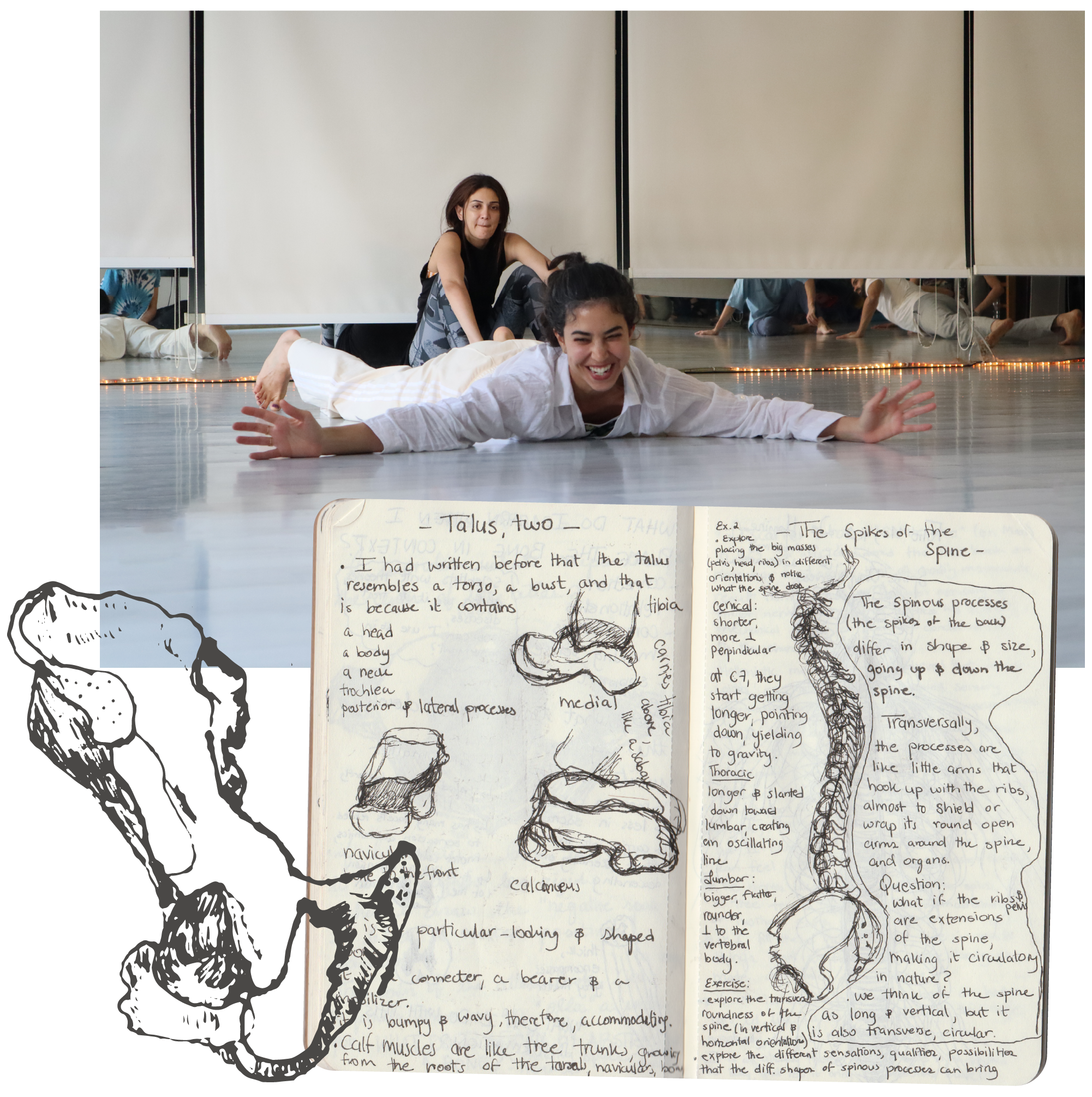 My class follows a form of research lab* where searching and sharing is encouraged. I invite participants to wonder in practical and poetic voices. How is my head related to my tail? What if the internal systems of my body act like a composition beyond function? What are the movement articulations of my ankle? What if bones are tokens of time and testaments to immortality? Is fascia a separate thing? What if my sternum remembers a distant memory that brings me to a collective one? What am I feeling and what can I do with this realization? The questions unfold on paper then in movement and in space.